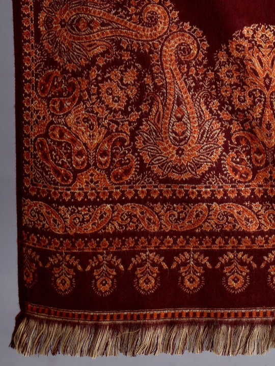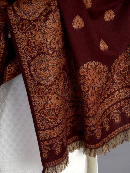 Maroon and brown woven design shawl, has a fringed border