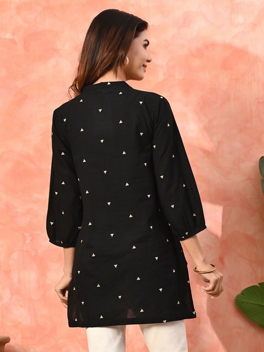 Black and white printed tunic ,has a mandarin collar, three-quarter sleeves,