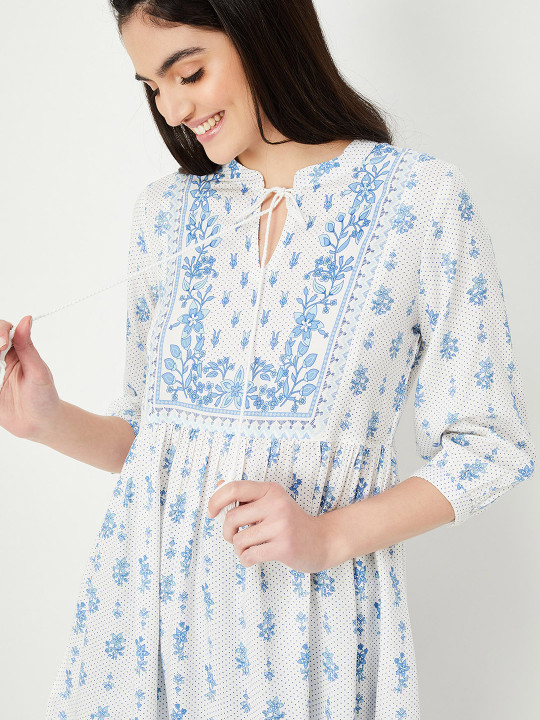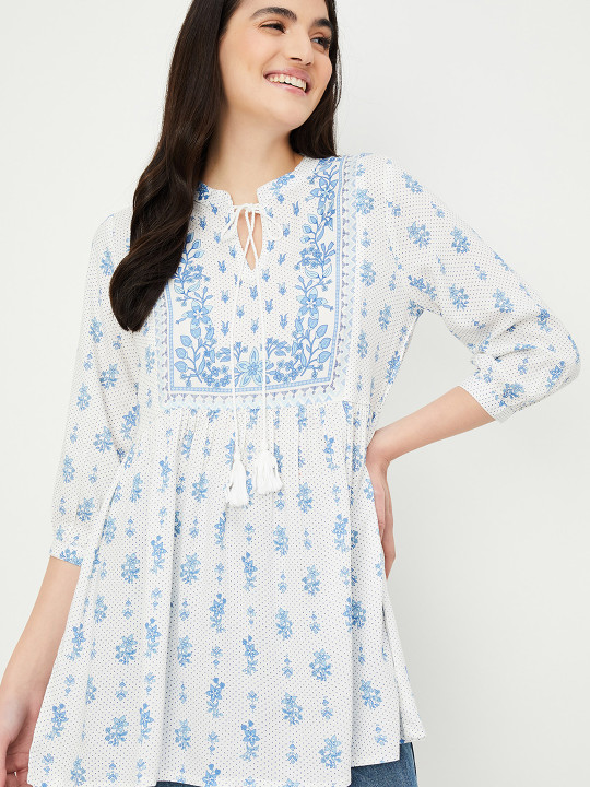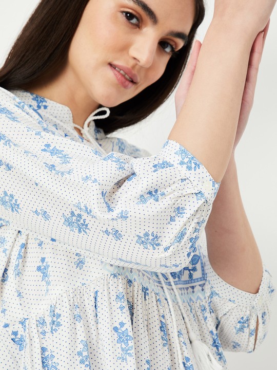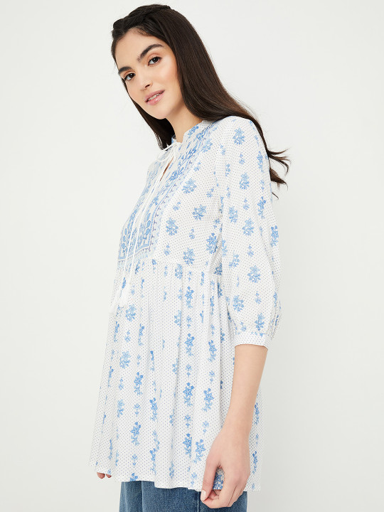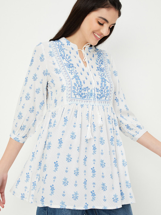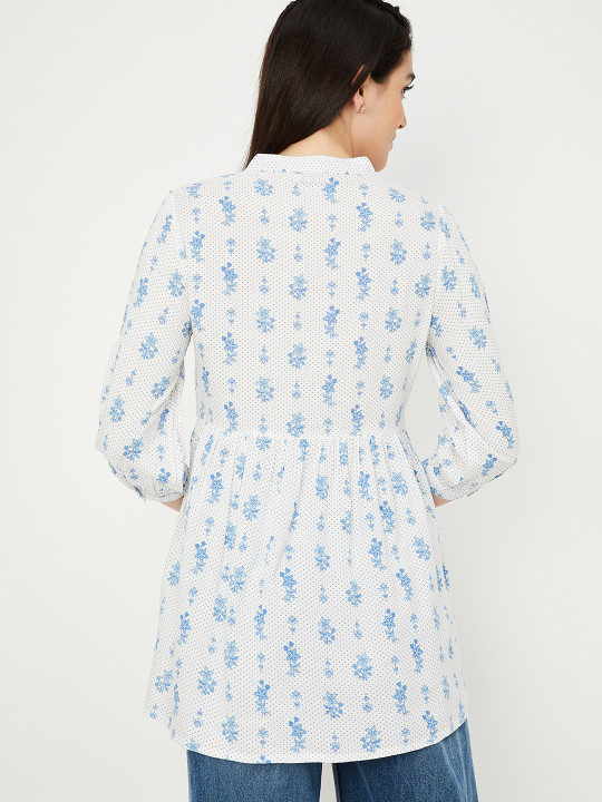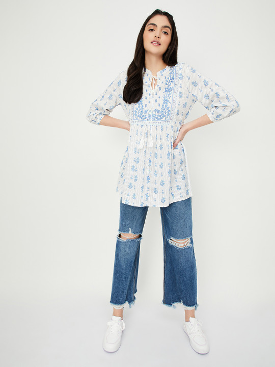 Off white and blue printed tunic ,has a mandarin collar, three-quarter sleeves,