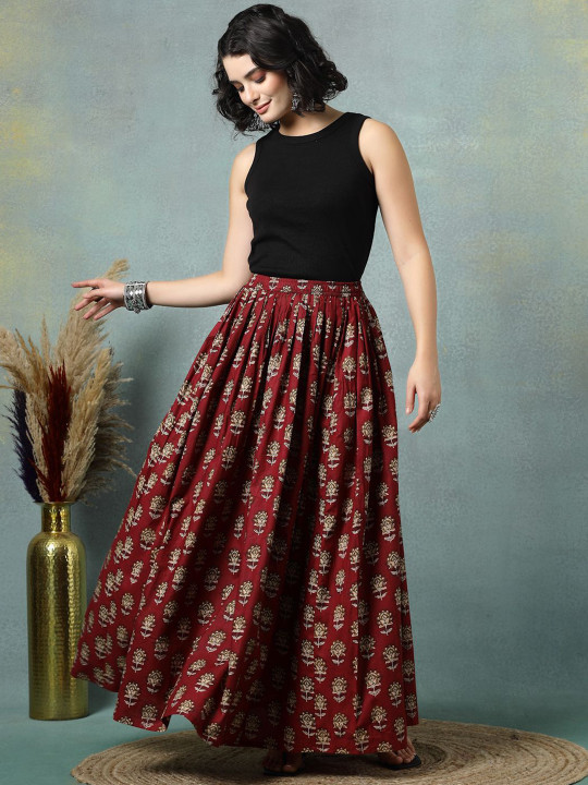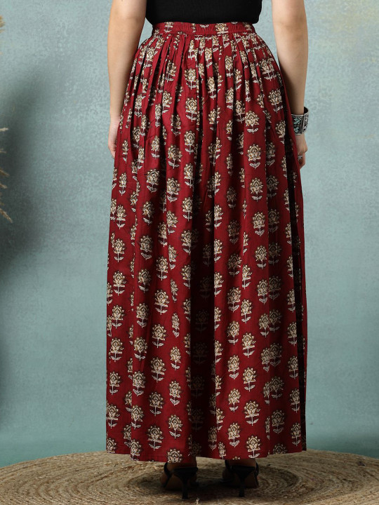 Maroon and beige floral printed flared maxi skirt, has an elasticated waistband with slip-on closure, and a flared hem