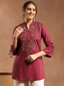 Maroon solid short viscose kurti with mandarin collar and floral embroidery on the yoke. Designed with relaxed 3/4th sleeves, it’s a breathable daily wear kurti for effortless styling.