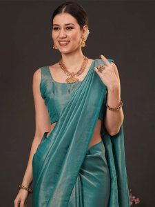 - Teal and gold-toned kanjeevaram saree